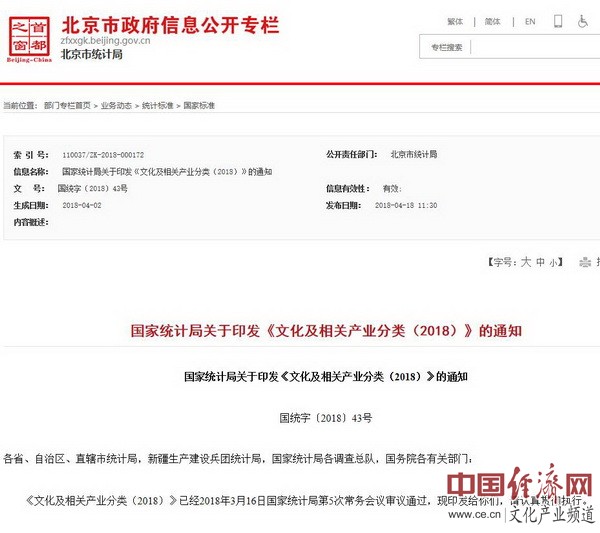 《文化及相關產業分類(2018)》已經2018年3月16日國家統計局第5次常務會議審議通過,現印發給你們,請認真貫徹執行。