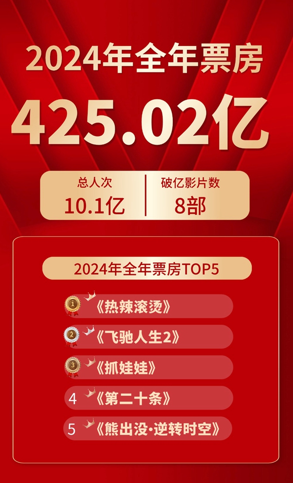 據(jù)貓眼專業(yè)版數(shù)據(jù),2024年全年共有8部影片破10億,年度票房冠軍為春節(jié)檔影片《熱辣滾燙》,全年大盤占比為8.1%。年度TOP10影片分別為《熱辣滾燙》《飛馳人生2》《抓娃娃》《第二十條》《熊出沒·逆轉(zhuǎn)時(shí)空》《默殺》《志愿軍:存亡之戰(zhàn)》《年會不能停!》《哥斯拉大戰(zhàn)金剛2:帝國崛起》《你想活出怎樣的人生》,其中,國產(chǎn)片占據(jù)八席,進(jìn)口片占據(jù)兩席,涵蓋類型包括喜劇、劇情、犯罪、戰(zhàn)爭、動(dòng)作、動(dòng)畫等。整體看來,2024年電影市場仍呈現(xiàn)出較強(qiáng)的韌性和上升空間。