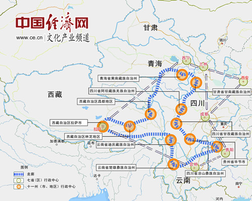 藏羌彝文化產業走廊依托的城市樞紐包括:四川省成都市、貴州省貴陽市、云南省昆明市、西藏自治區拉薩市、陜西省西安市、甘肅省蘭州市和青海省西寧市。