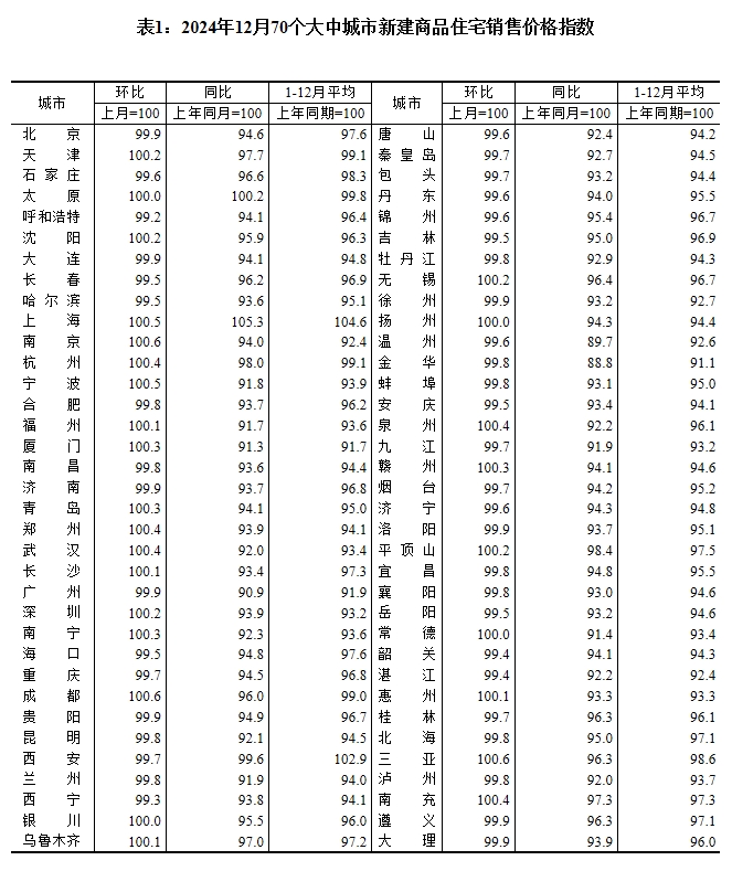中國經(jīng)濟(jì)網(wǎng)北京1月17日(記者 李方) 17日,國家統(tǒng)計(jì)局發(fā)布2024年12月份70個(gè)大中城市商品住宅銷售價(jià)格變動(dòng)情況統(tǒng)計(jì)數(shù)據(jù)。數(shù)據(jù)顯示,2024年12月份,70個(gè)大中城市中,一線城市商品住宅銷售價(jià)格環(huán)比上漲,二三線城市環(huán)比總體降幅收窄;一二三線城市同比降幅均繼續(xù)收窄。