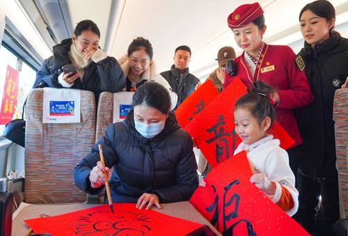 津興城際G8844次列車上,旅客現場手寫書法福字、畫龍頭。(中國鐵路北京局集團有限公司供圖)