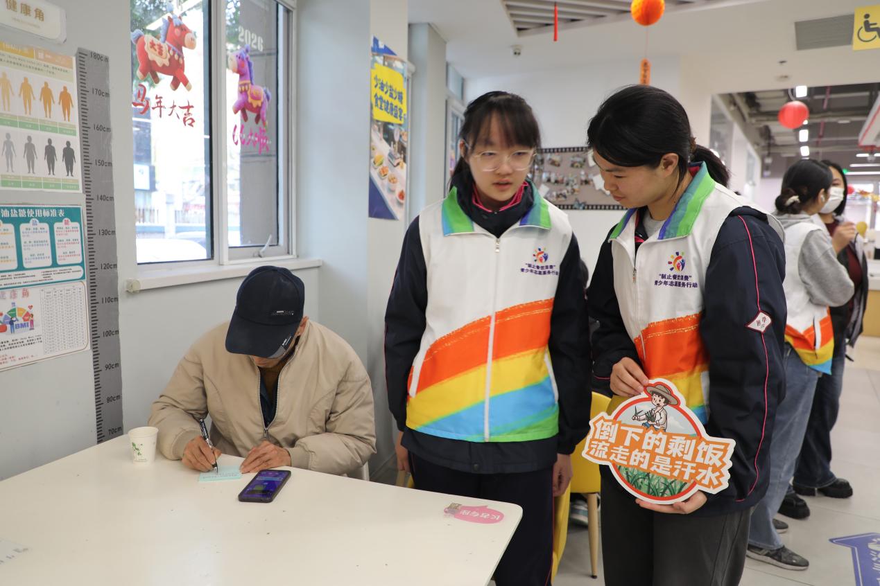 在實(shí)踐環(huán)節(jié),志愿者們將節(jié)約糧食的標(biāo)語海報(bào)張貼在餐廳顯著位置,并化身“制止餐飲浪費(fèi)”宣傳員,向餐廳中的食客講解節(jié)約糧食的重要性,邀請(qǐng)食客寫下減少浪費(fèi)的心得體會(huì),將“一起來光盤”的節(jié)約理念傳遞給餐廳的消費(fèi)者。