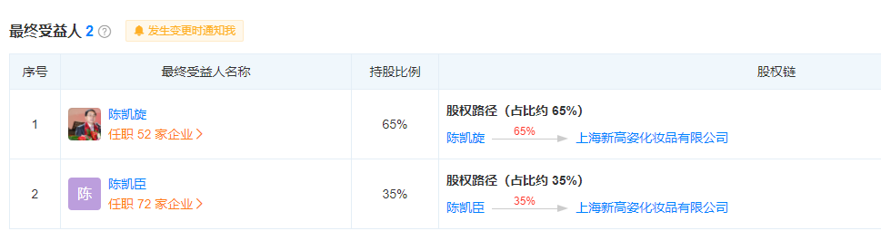 記者查詢資料顯示,上海新高姿化妝品有限公司共生產了800多款國產非特殊用途化妝品,其中包括高姿、赫拉、芊嘉、安妍雅等多個知名化妝品品牌。公司共有九個子公司,最終受益人為陳凱旋,持股占比65%。