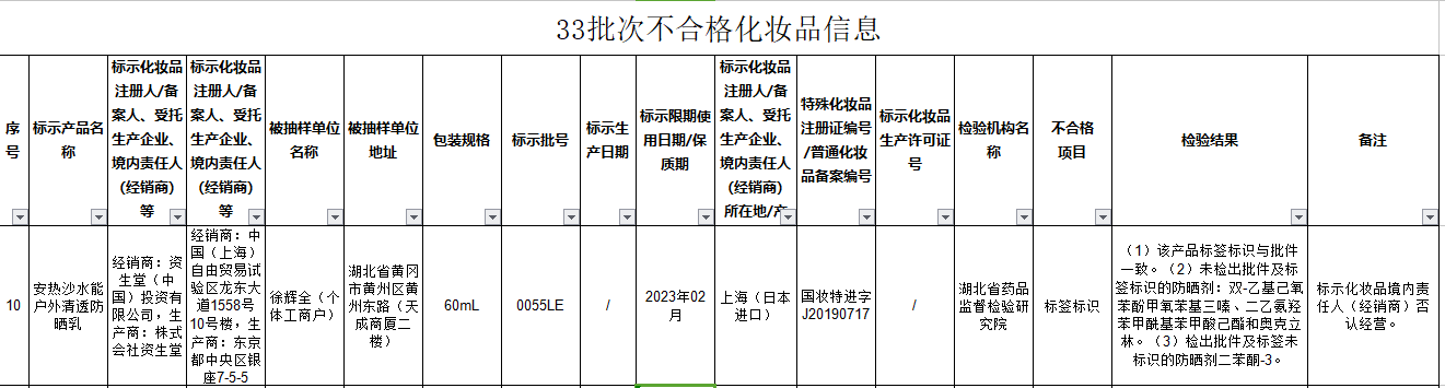 通告顯示,經(jīng)湖北省藥品監(jiān)督檢驗研究院檢測,經(jīng)銷商為資生堂(中國)投資有限公司,生產(chǎn)商為株式會社資生堂銷售的產(chǎn)品安熱沙水能戶外清透防曬乳產(chǎn)品不合格,檢驗結(jié)果為未檢出批件及標(biāo)簽標(biāo)識的防曬劑:雙-乙基己氧苯酚甲氧苯基三嗪、二乙氨羥苯甲酰基苯甲酸己酯和奧克立林;檢出批件及標(biāo)簽未標(biāo)識的防曬劑二苯酮-3。