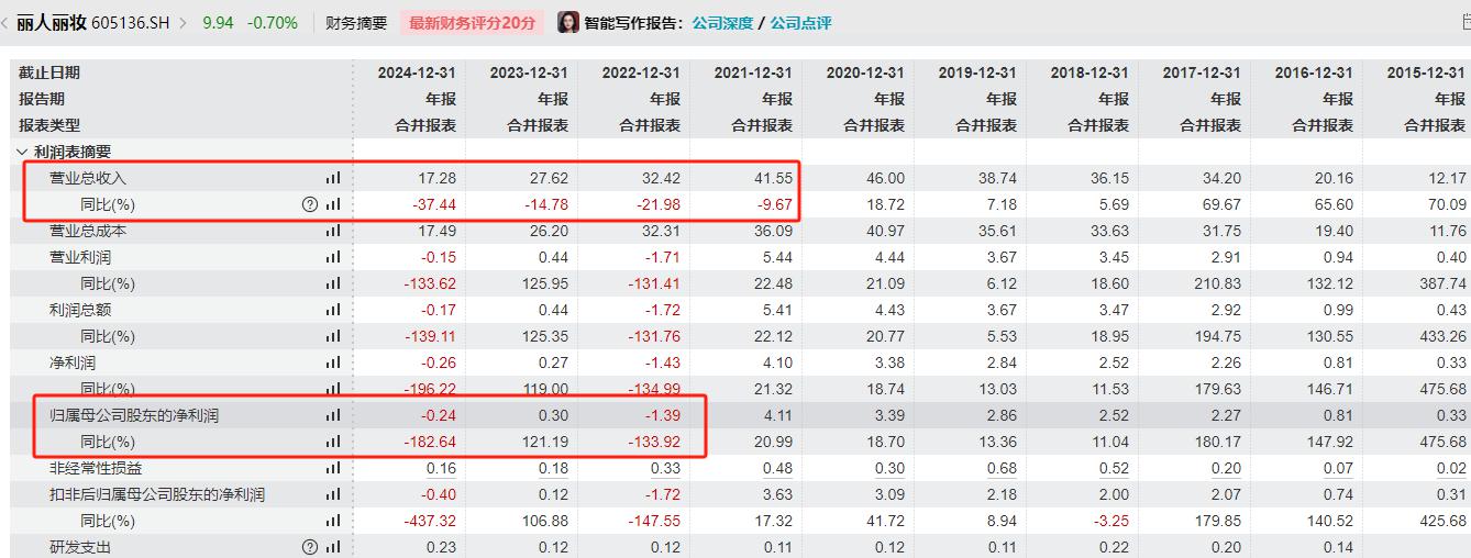 Wind顯示,2021年至2024年,麗人麗妝營(yíng)收持續(xù)回落,歸母凈利潤(rùn)在2022年、2024年出現(xiàn)虧損。