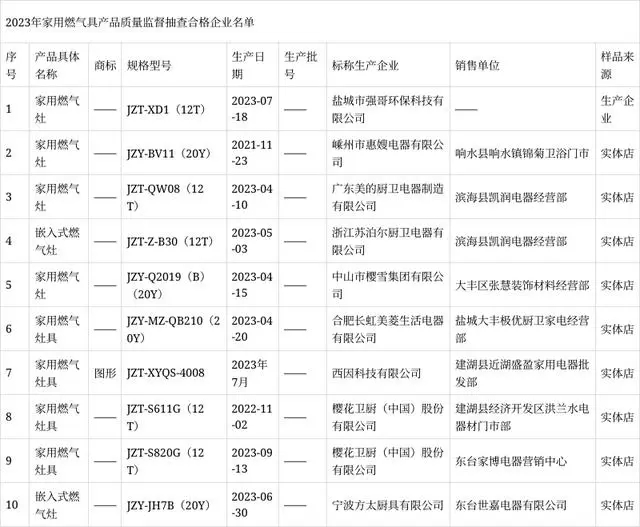 2023年度鹽城市市場監督管理局委托南京市產品質量監督檢驗院(南京市質量發展與先進技術應用研究院)組織實施家用燃氣具產品市級監督抽查。本次抽查計劃10批次,抽到10批次,經檢驗合格10批次。
