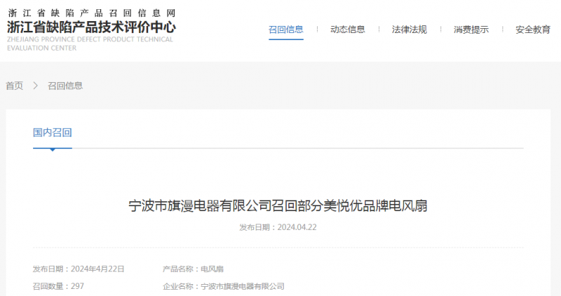 目前,寧波市旗漫電器有限公司受缺陷調查影響按照《消費品召回管理暫行規定》的要求,主動向浙江省市場監督管理局和寧波市市場監督管理局報告了召回計劃,將自即日起,召回2023年5月22日至25日期間制造的部分美悅優品牌型號QM-LD001電風扇(循環扇),涉及數量297臺。