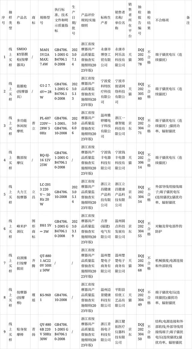 本次抽查了43批次按摩器具產品,其中9批次產品不合格。不合格項目為對觸及帶電部件的防護、機械強度、結構、電源連接和外部軟線、外部導線用接線端子、端子騷擾電壓(連續騷擾)、騷擾功率、輻射騷擾。