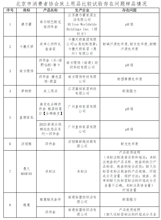 針對本次比較試驗情況,北京市消費者協會提醒消費者,購買床上用品時,應首選大、中商場或大眾認可的正規線上平臺,從品牌專賣店或平臺自營店購買,謹慎購買價格過低的商品,盡量不要選擇標識信息模糊、內容不全、明顯不正確,甚至沒標識的產品,其產品質量和售后服務難以保證。