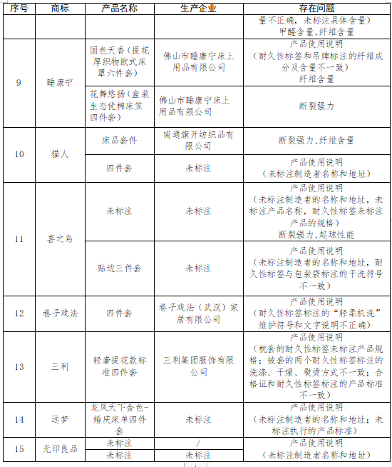 試驗發現,遠夢、巷子戲法、三利、雅鹿、喜之鳥、無印良品、睡康寧、貓人、曼凡MANFAN的11件樣品產品使用說明不規范或不正確。產品使用說明標簽應包括產品名稱、產品號型或規格、纖維成分及含量、維護方法、執行的產品標準、安全類別、制造者信息等信息。該11件樣品的標識信息出現未標注制造者名稱和地址、未標注執行的產品標準、耐久性標簽未標注產品號型或規格、合格證或耐久性標簽標注不正確或不一致等問題。產品使用說明不規范或不正確,會影響消費者正確選購或使用床上用品。