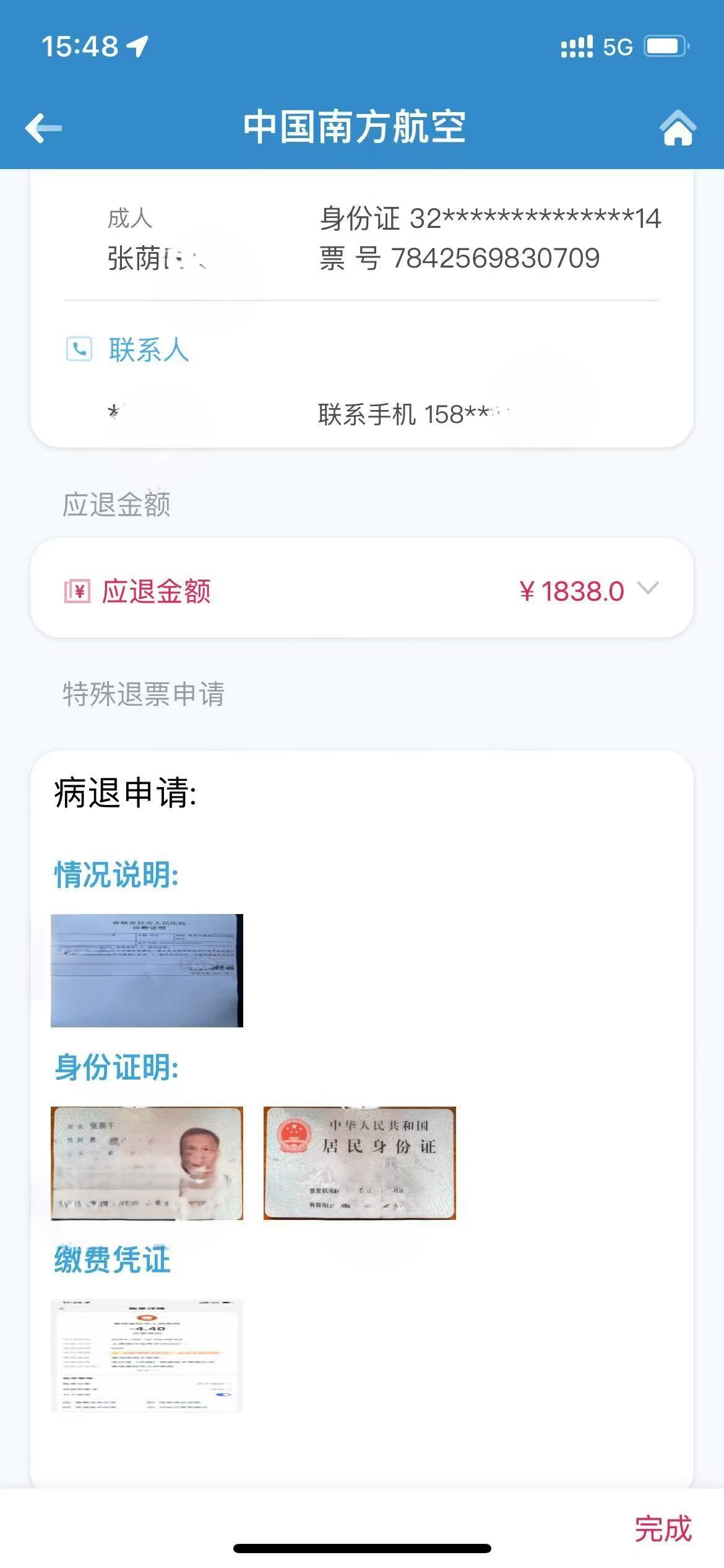 “按照公告,我母親作為同行人員完全合乎規定。不過,南航APP的退票操作界面和這個規定要求提交的材料有些不一致。”張先生說,南航APP上病退申請有3項:情況說明、身份證明、繳費憑證,均只能上傳圖片。“我在情況說明欄上傳了醫院的診斷證明,繳費憑證欄上傳了購買氧氣罐的訂單截圖。”張先生說,如果南航APP上注明要上傳醫療發票或住院押金證明,他就不會上傳診斷證明了。