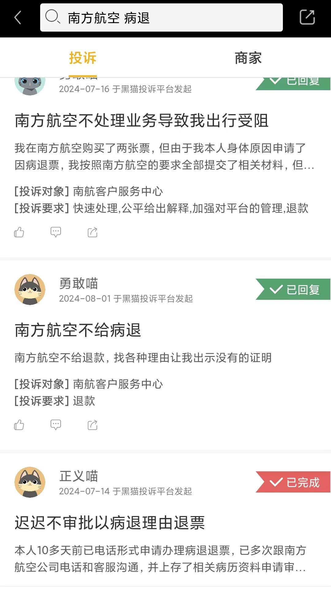 8月26日,記者在黑貓投訴平臺以“南方航空 病退”為關鍵詞搜索發現,共有272起相關投訴,反映的問題涉及審核慢、客服人員不專業、病退申請無法撤回修改等。