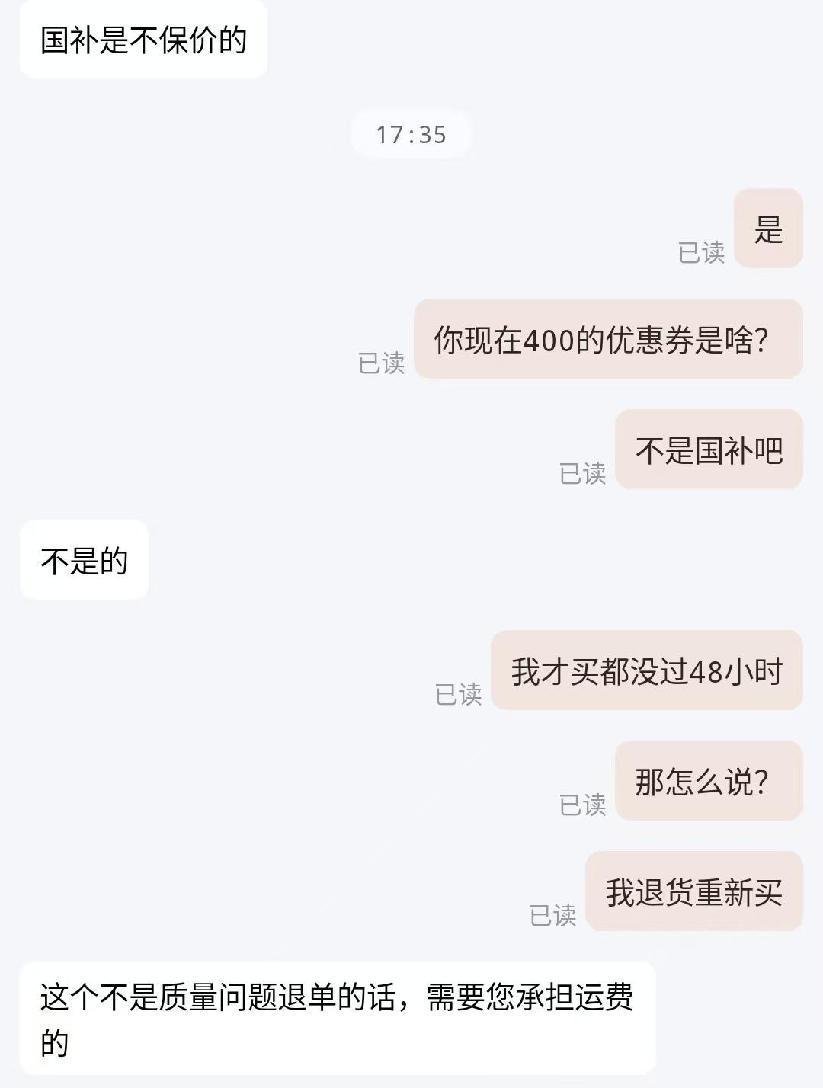 面對這突如其來的降價,李先生深感憤怒與無奈。他嘗試通過平臺客服協(xié)調(diào)退還差價,但得到的答復卻是:由于產(chǎn)品享受了政府補貼,差價不予退還。李先生氣憤地表示:“有種被當傻子耍的感覺。”經(jīng)過多次溝通,李先生最終與客服協(xié)商達成了無條件退貨的協(xié)議,退貨運費由平臺承擔。隨后,李先生又用家人的賬號領(lǐng)取政府補貼后,加上新的活動優(yōu)惠,以低于原購買價500元的價格于同一網(wǎng)購平臺再次購買了同一款空氣凈化器。