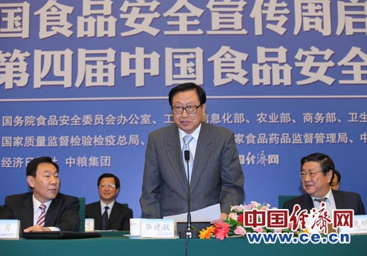 6月11日至17日被確定為今年的全國食品安全宣傳周。宣傳周主題為“共建誠信家園 同鑄食品安全”。全國食品安全宣傳周啟動儀式由國務院食品安全委員會辦公室、工業(yè)和信息化部、農(nóng)業(yè)部、商務部、衛(wèi)生部、國家工商總局、國家質(zhì)檢總局、國家糧食局、國家食品藥品監(jiān)管局、中國科協(xié)共同主辦,經(jīng)濟日報社、中糧集團承辦,中國經(jīng)濟網(wǎng)執(zhí)行承辦。圖為全國人大常委會副委員長華建敏宣布全國食品安全宣傳周啟動 裴小閣攝