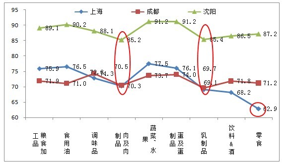 針對食品安全現(xiàn)狀信心指數(shù)較低的三個(gè)城市:上海、成都、沈陽。沈陽表現(xiàn)相對較好,信心指數(shù)較高;其次是上海;最低的是成都。其中肉及肉制品和乳制品在三大城市中的安全信心指數(shù)都相對偏低,直接影響了三大城市的綜合信心程度。此外,食用油在成都的安全信心指數(shù)、零食在上海的安全信心指數(shù)也有待提高。