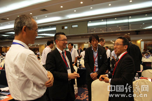 由中國道路交通安全協會、中國汽車技術研究中心和中國經濟網共同主辦的“2013中國道路交通安全論壇”于8月29日在北京首都大酒店舉行。圖為日產汽車株式會社企劃·先行技術開發本部部長高橋信彥(右)與參會嘉賓進行交流。中國經濟網 裴小閣 攝影